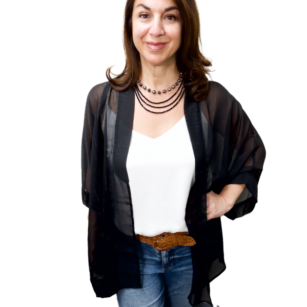 Last but not least, we also have the gorgeous Square Kimono in the Black Pinstripe. You could just see the ever so slight metallic thread there which just adds a beautiful elegant touch.