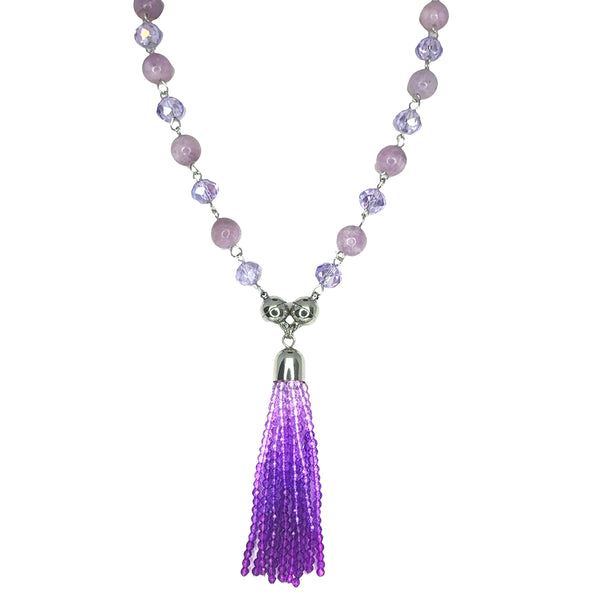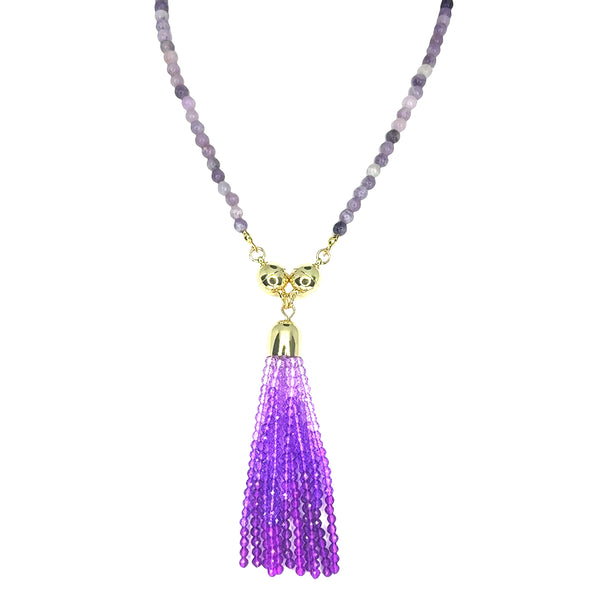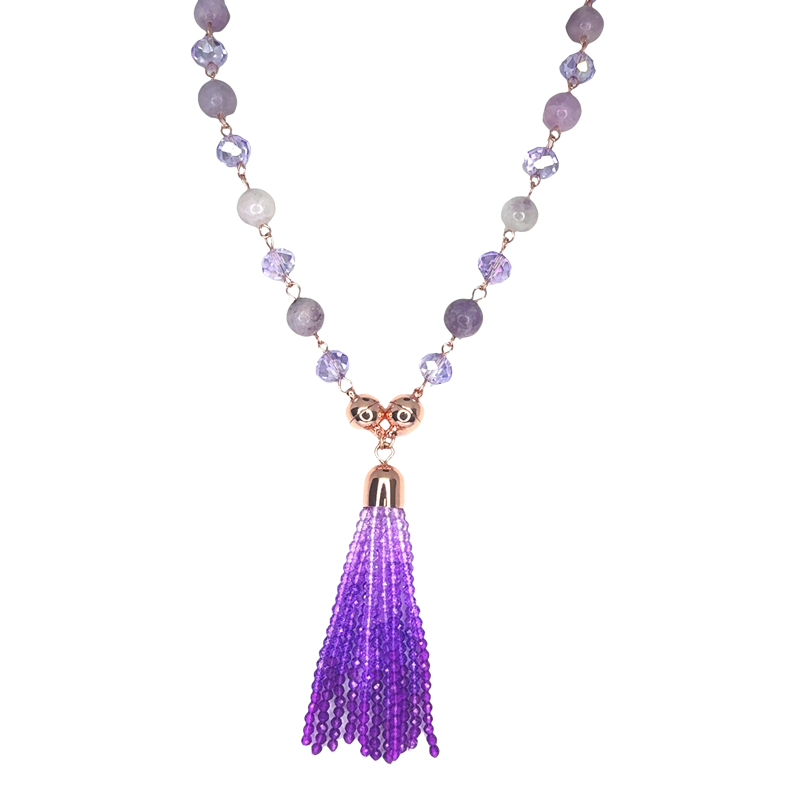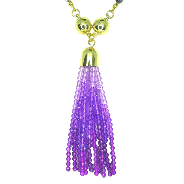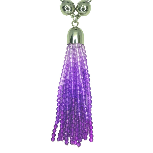 Make a statement with our stunning Crystal Ombre Tassel in rich purple tones. Hand-strung with delicate 3mm beads, the ombre begins with lighter shades near the magnetic clasp and deepens into darker purple for a beautiful graduated effect. Finished with your choice of rose gold, silver, or yellow gold magnets.