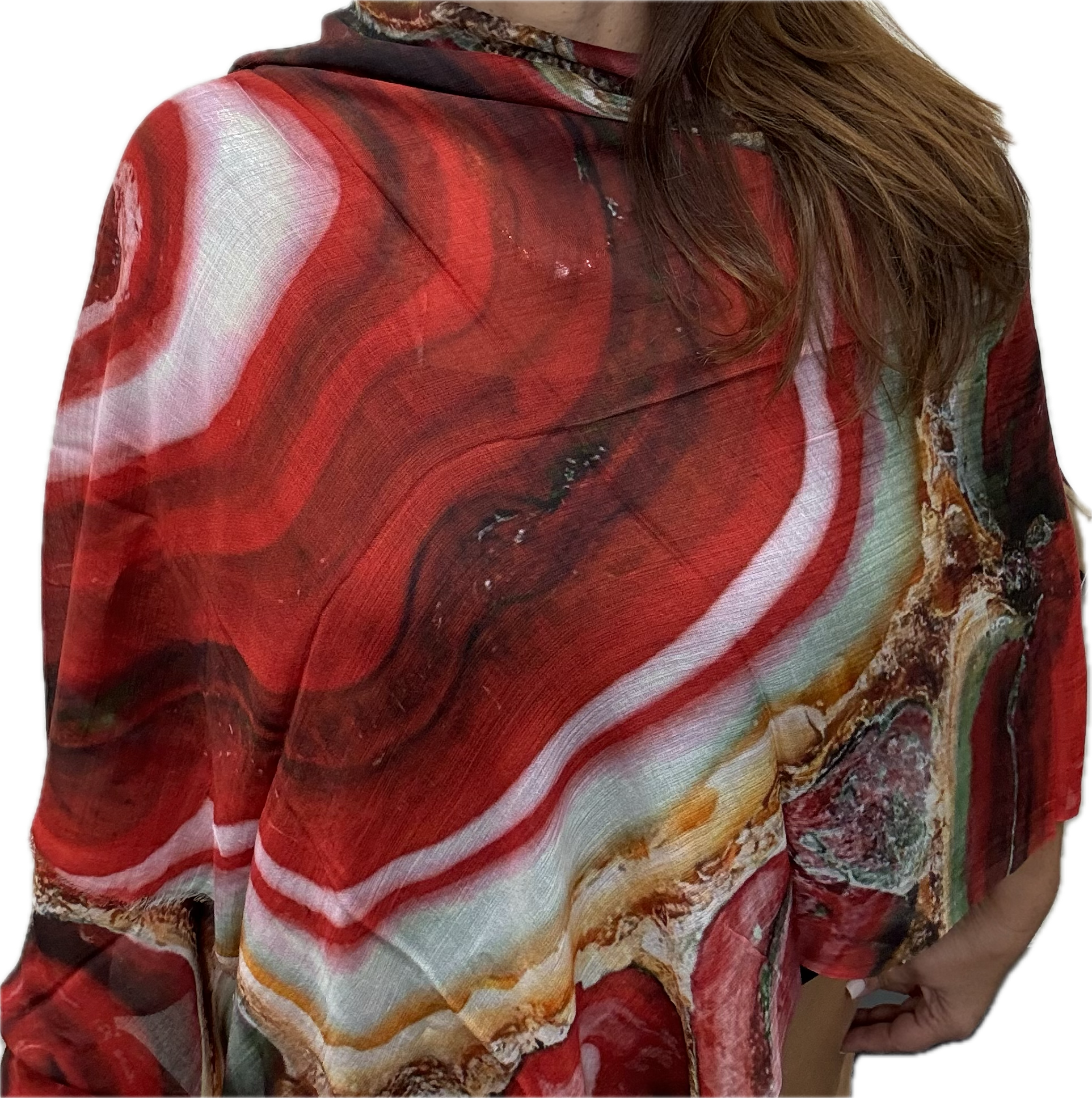 This design of this stunning scarf is made up of the cross section of a stunning agate. A range of colours appear in this from mainly reds, oranges, emeralds and more.