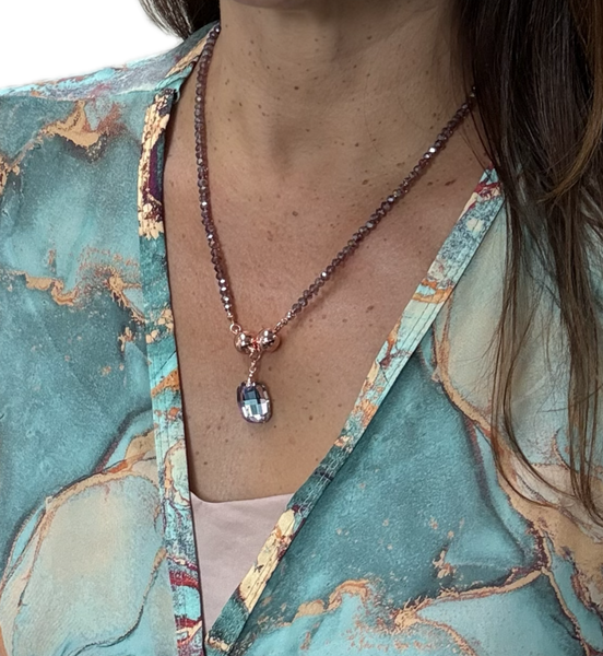 The stunning Baby Cushion pendant is a lovely faceted imperfect rectangular shape pendant in the popular peacock colour which has tones of lilac and turquoise.