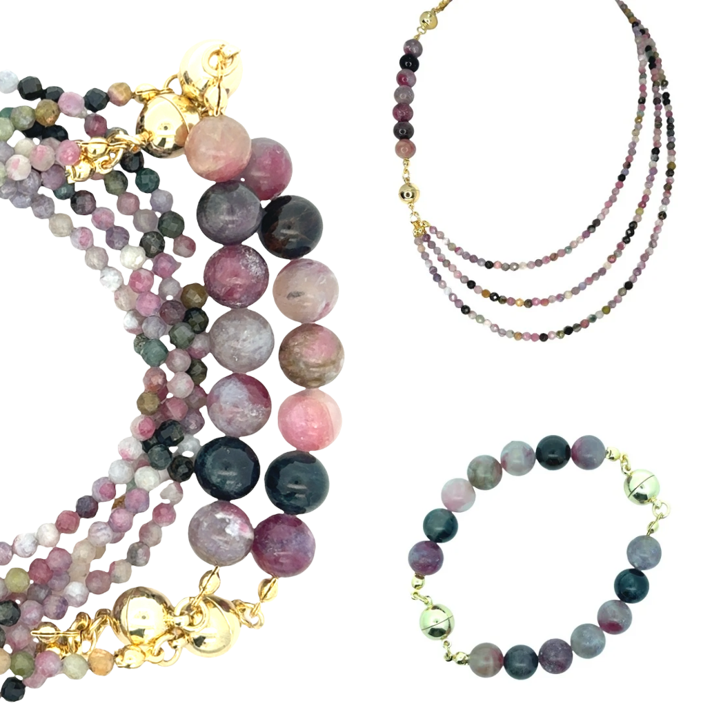 Elegant and versatile, the Tourmaline Natural Stone Range brings vibrant energy and playful elegance to any look. Crafted from 4mm semi-precious, faceted small tourmaline beads  and larger 10mm round beads in soft pinks, purples, and complementary shades, these pieces capture a luminous, modern beauty that’s perfect for any occasion.