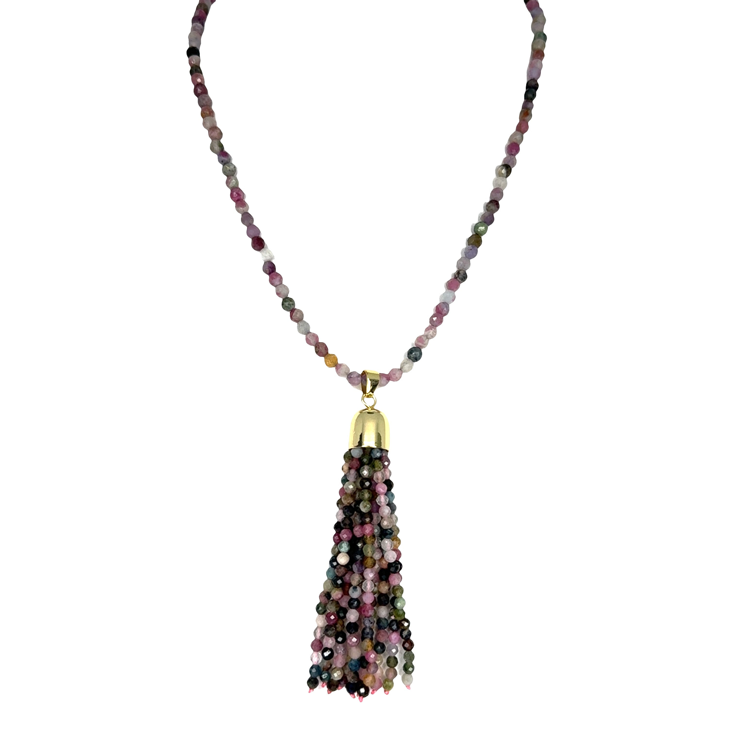 The TOURMALINE tassel is a short necklace that can be worn on it's own. When added to it's matching 10 Way Necklace it can create even more styles. (This product is the Tassel on a 43cm single strand only)