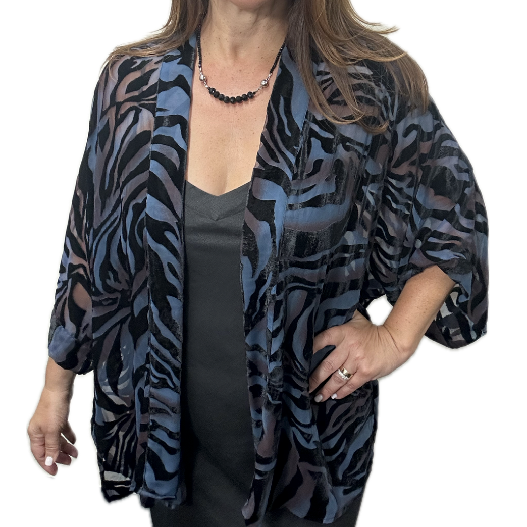 Parisukat na Kimono - Itim na May Disenyong Veludo - Usok-asul at Pulang Ubas