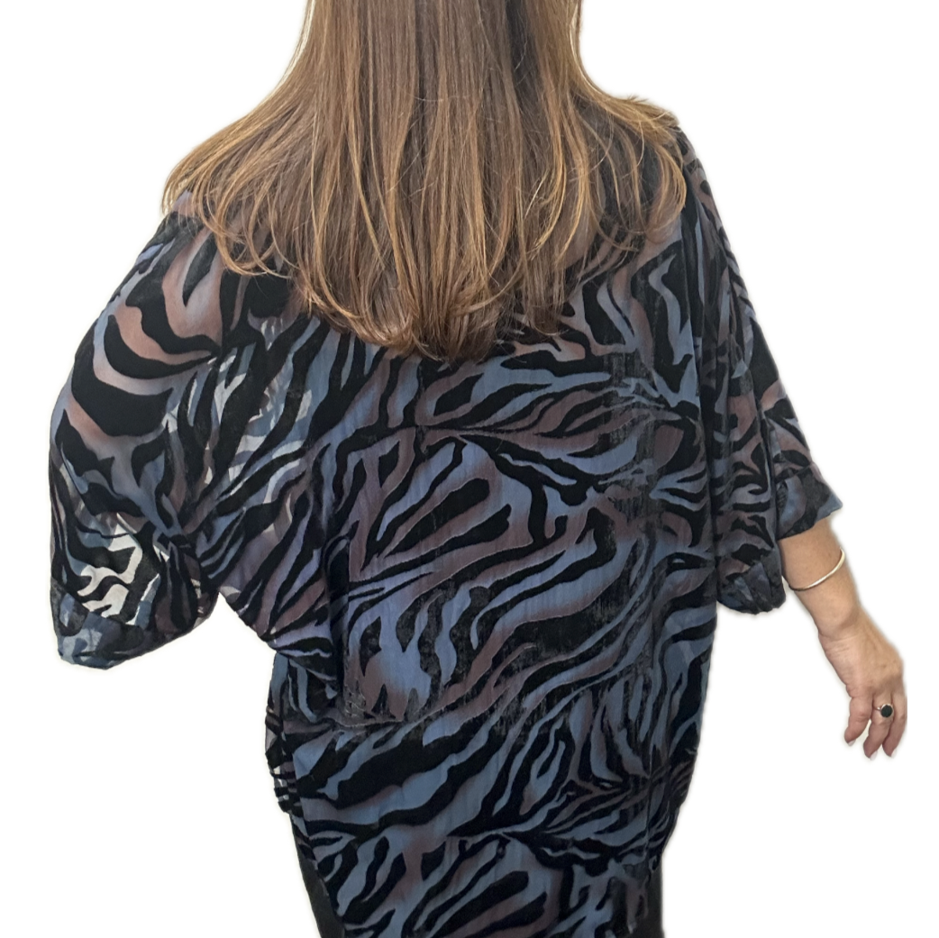 Parisukat na Kimono - Itim na May Disenyong Veludo - Usok-asul at Pula - Maria Nicola