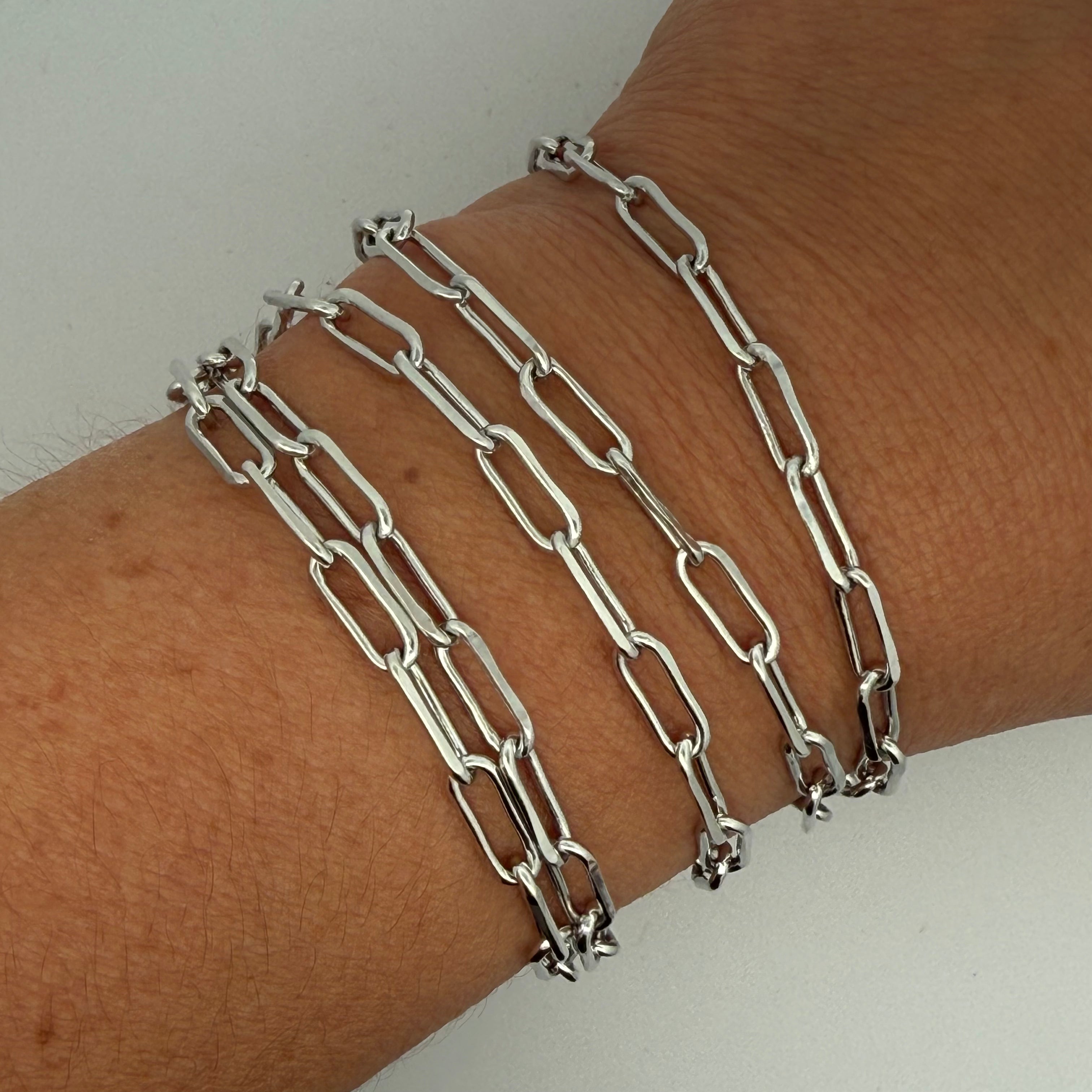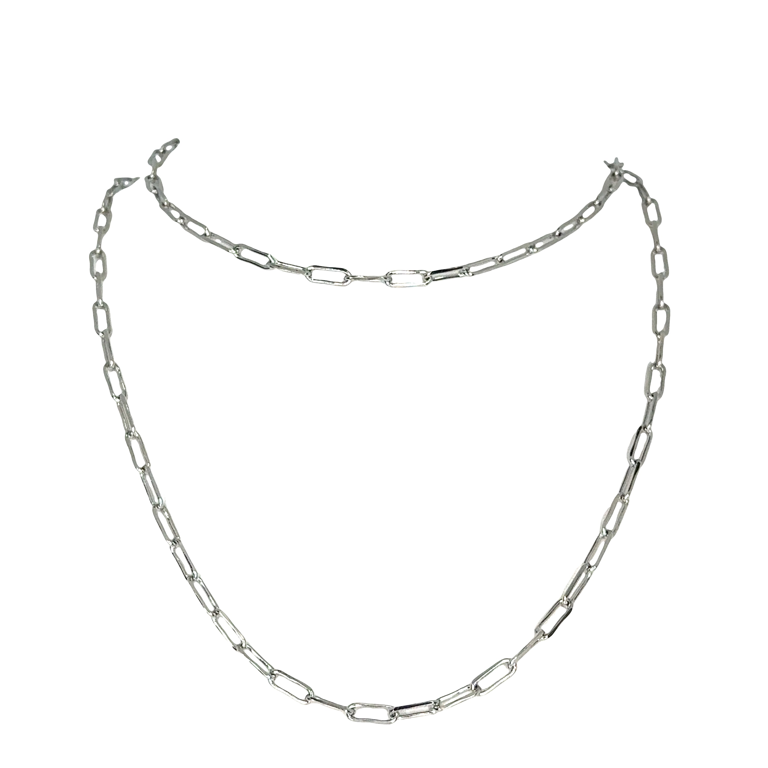 The Paperclip Long Strand Necklace is made up of a flat oval-shaped chain, the outside shape of a paperclip, each link is 12mm long.