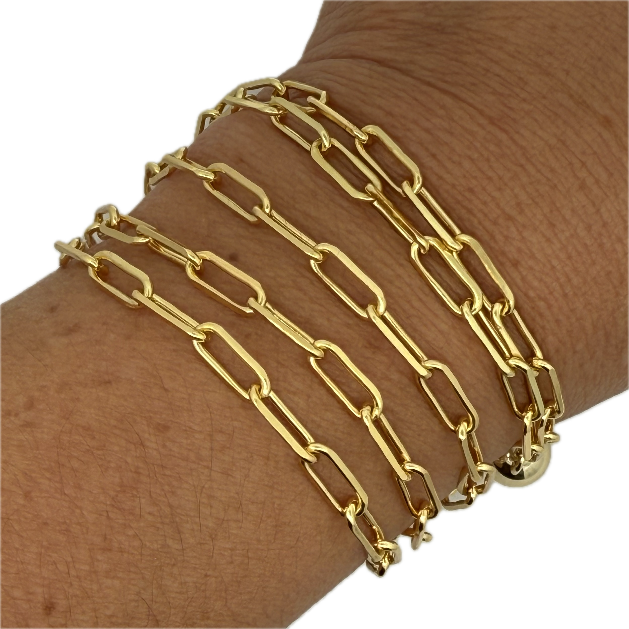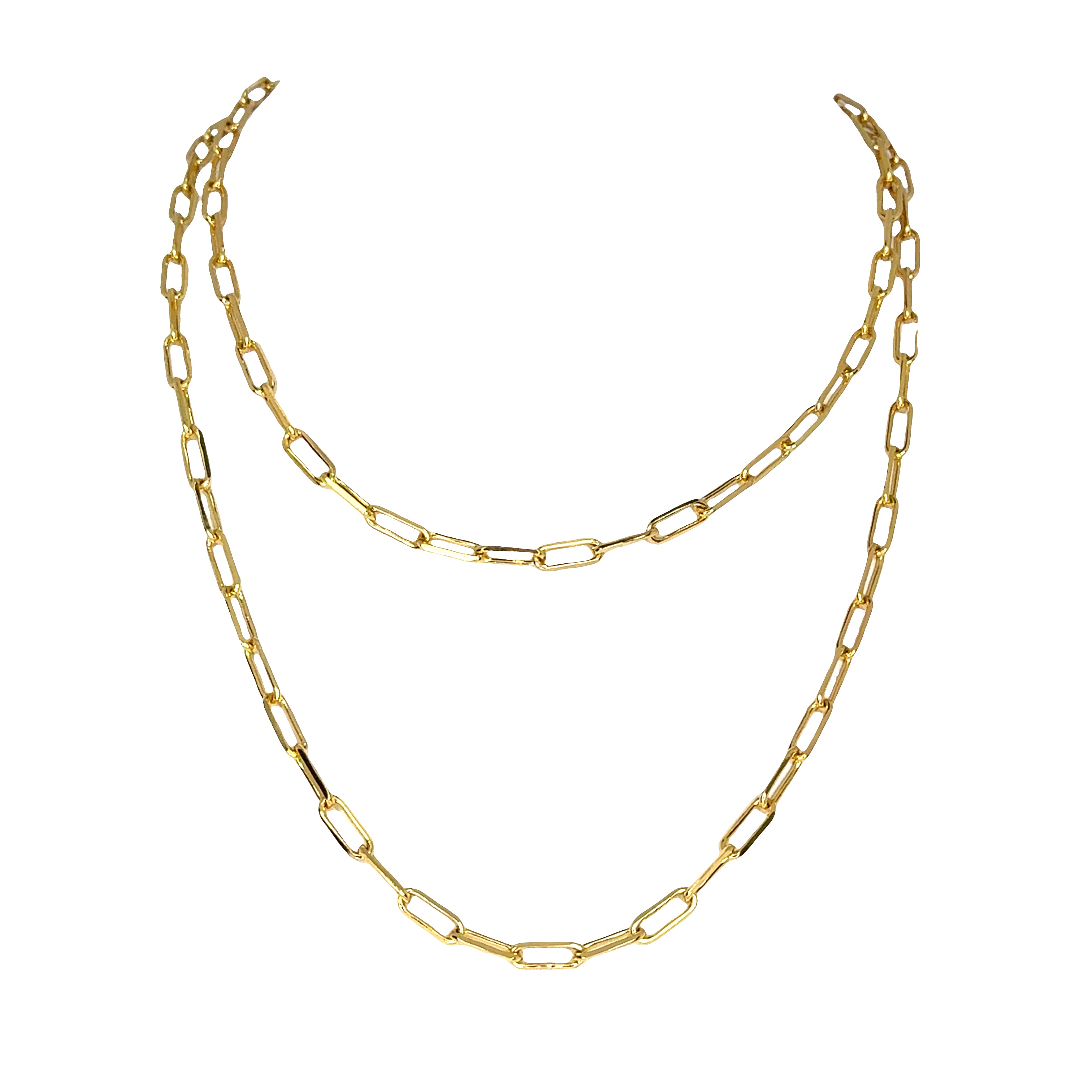 The Paperclip Long Strand Necklace is made up of a flat oval-shaped chain, the outside shape of a paperclip, each link is 12mm long.