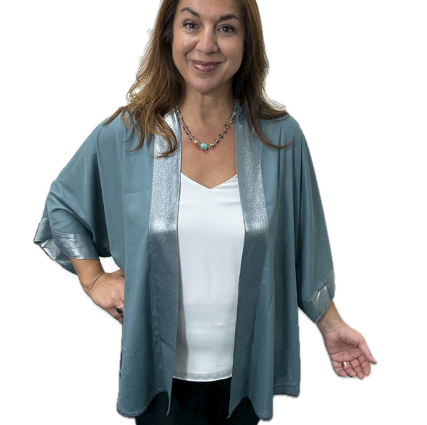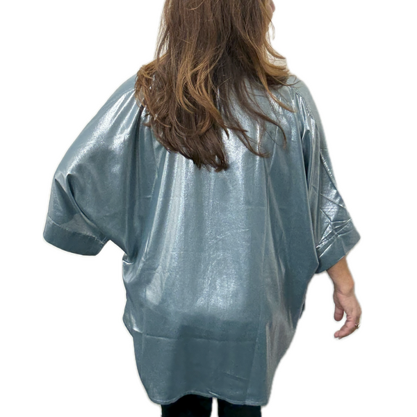 This gorgeous Square Kimono is a metallic fabric that looks like minty seafoam liquid with every movement. It is also reversible giving you a dark seafoam matt version with metallic trims. There is no label on this garment to allow you to wear it both ways.